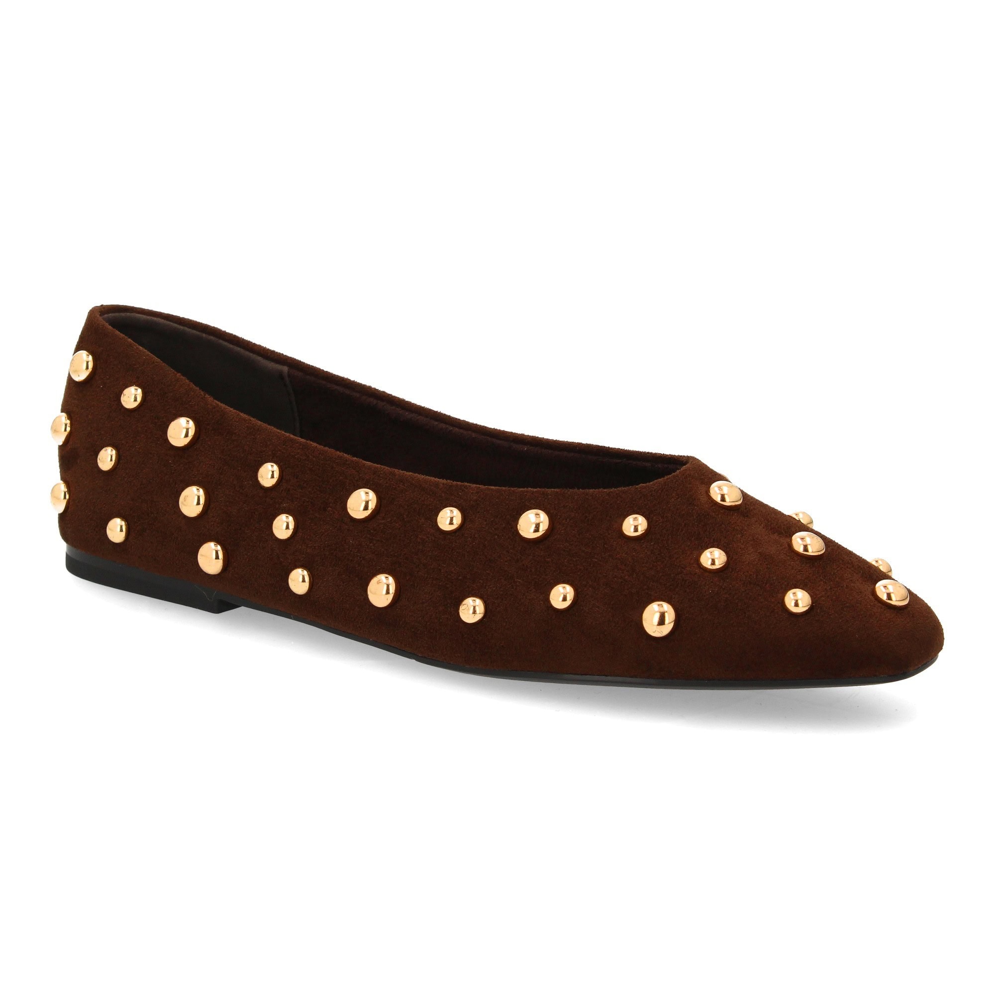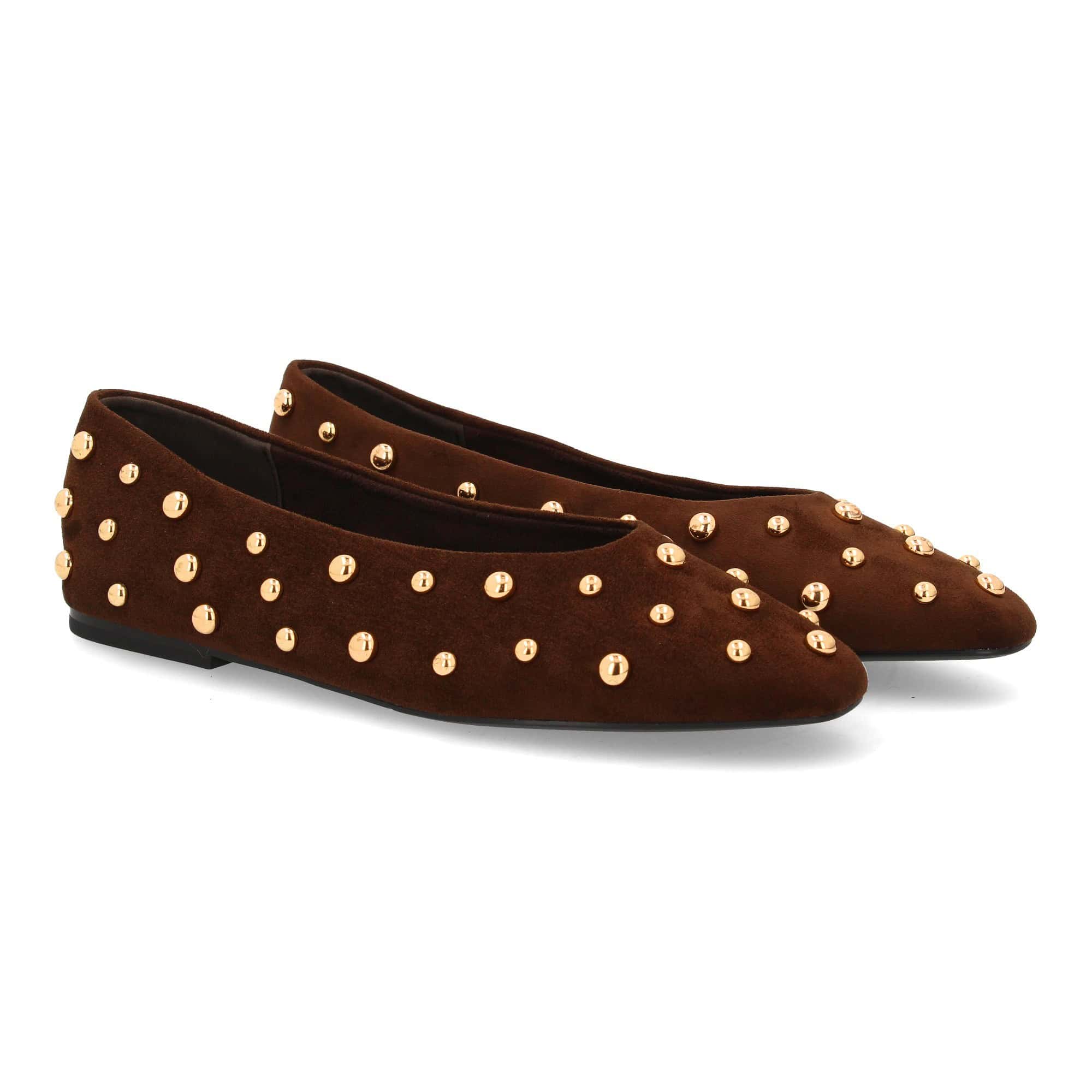Bailarina elegante con tachuelas metálicas diseño moderno. Su punta fina y suela plana garantizan comodidad. Sin cierre, ideal para mujer temporada Otoño Invierno.