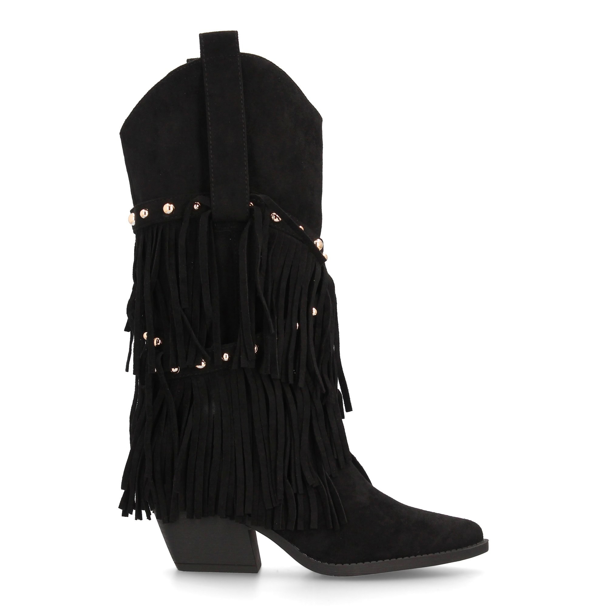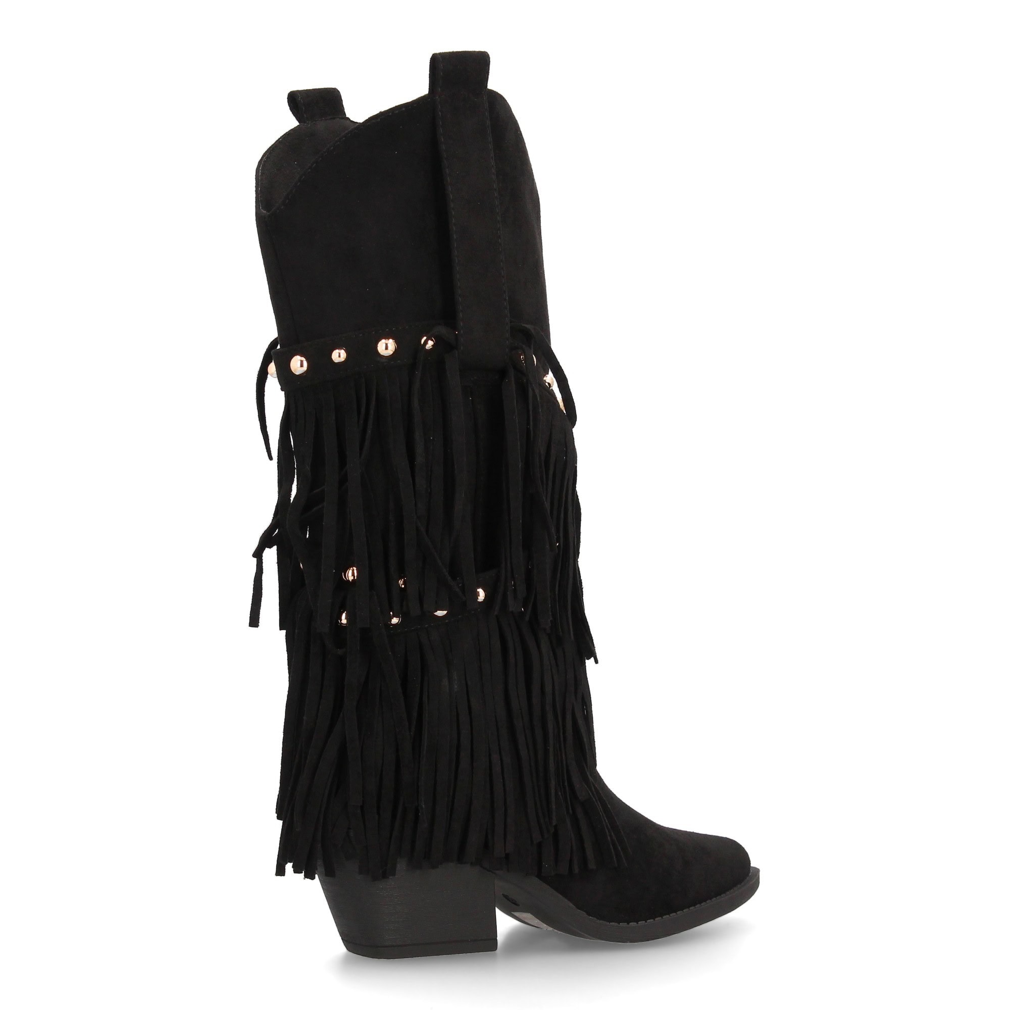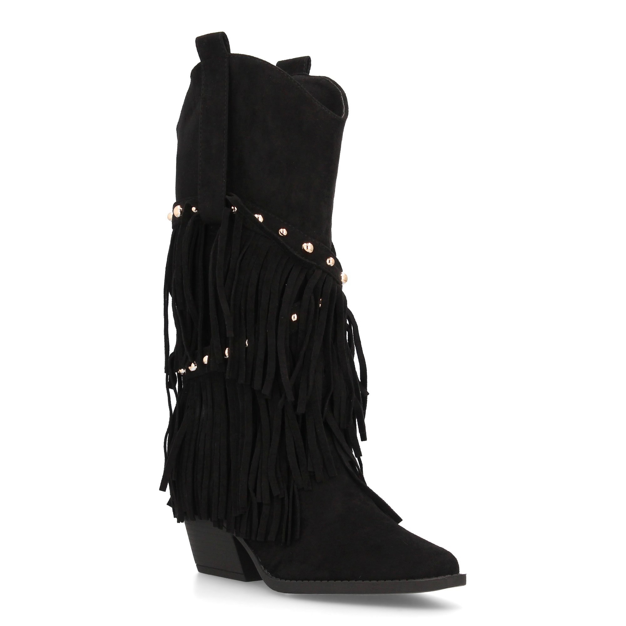 Bota de estilo western con caña alta decorada con flecos en cascada y tachuelas metálicas, punta fina y tacón cubano. Ideal para mujer en temporada de Otoño Invierno
