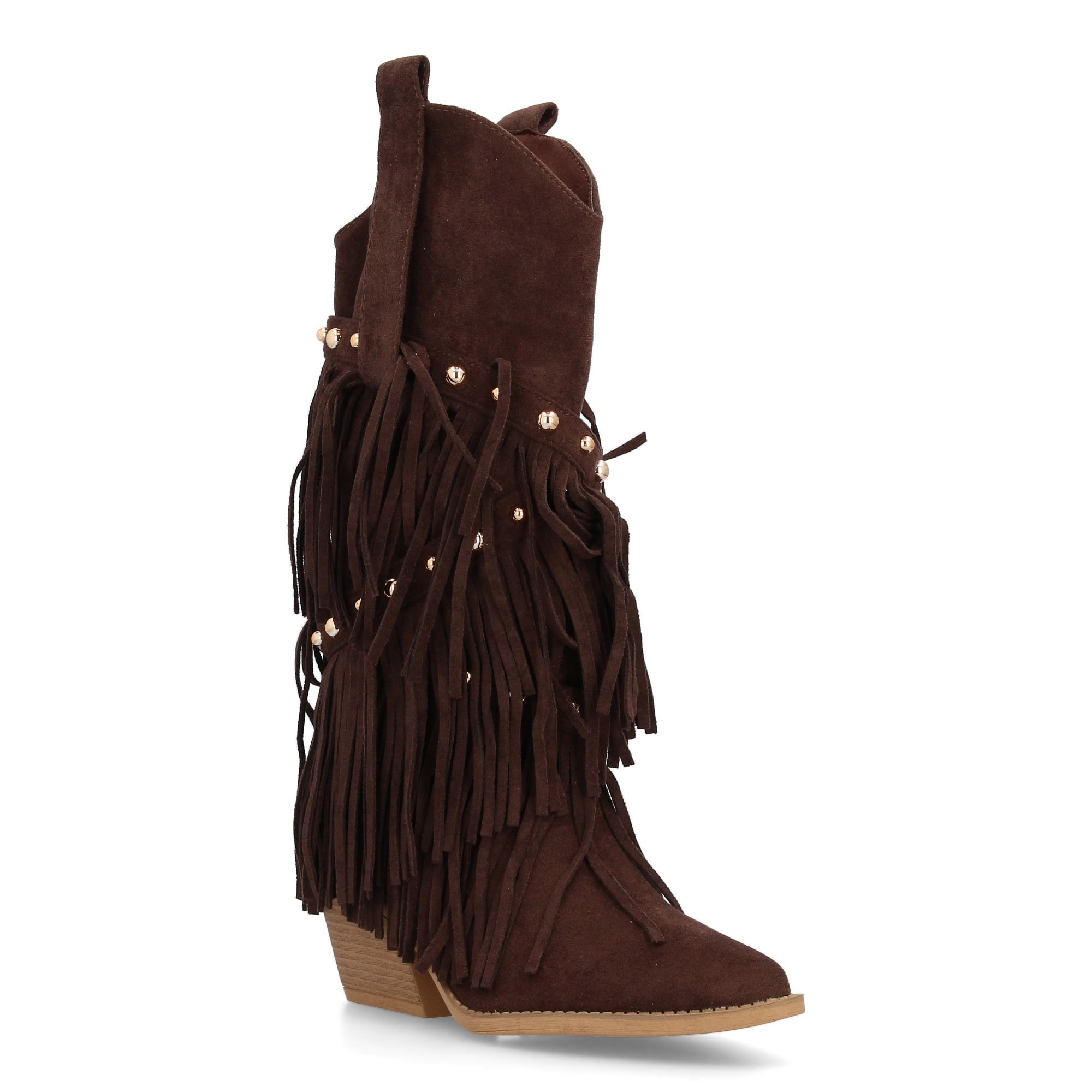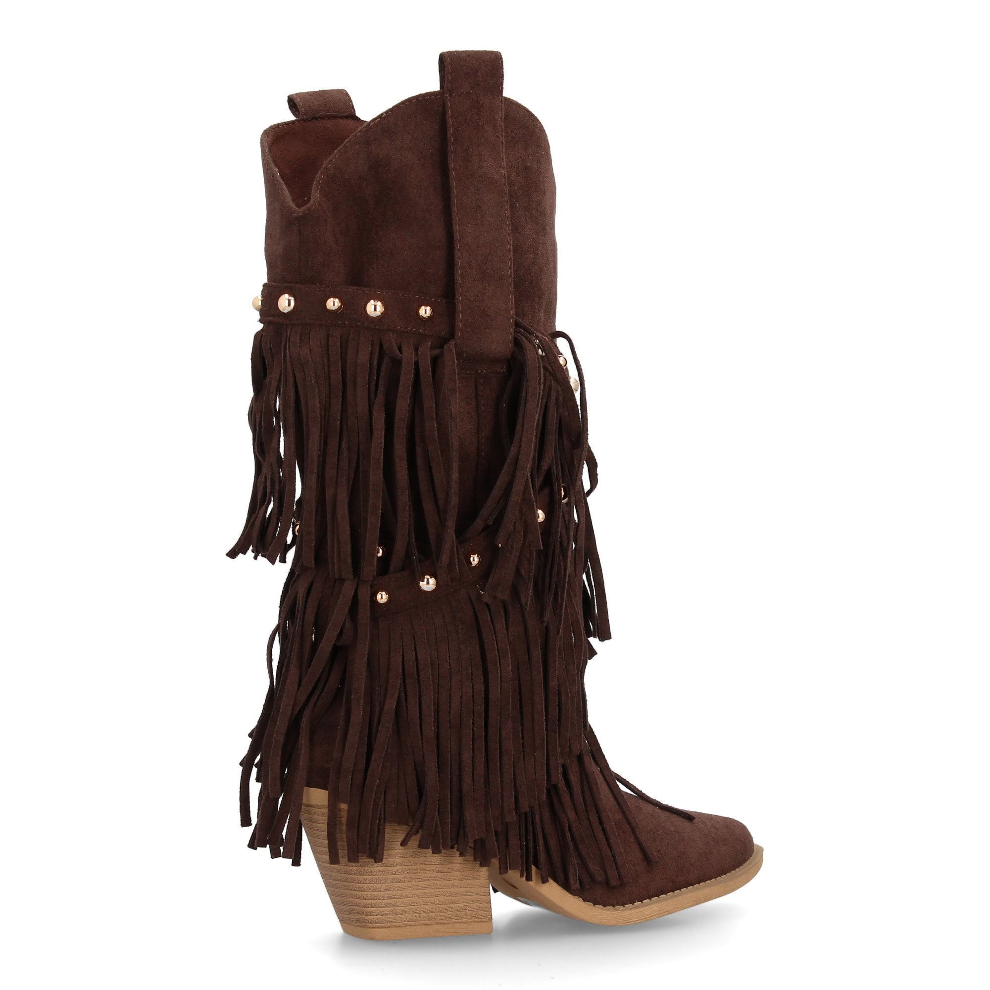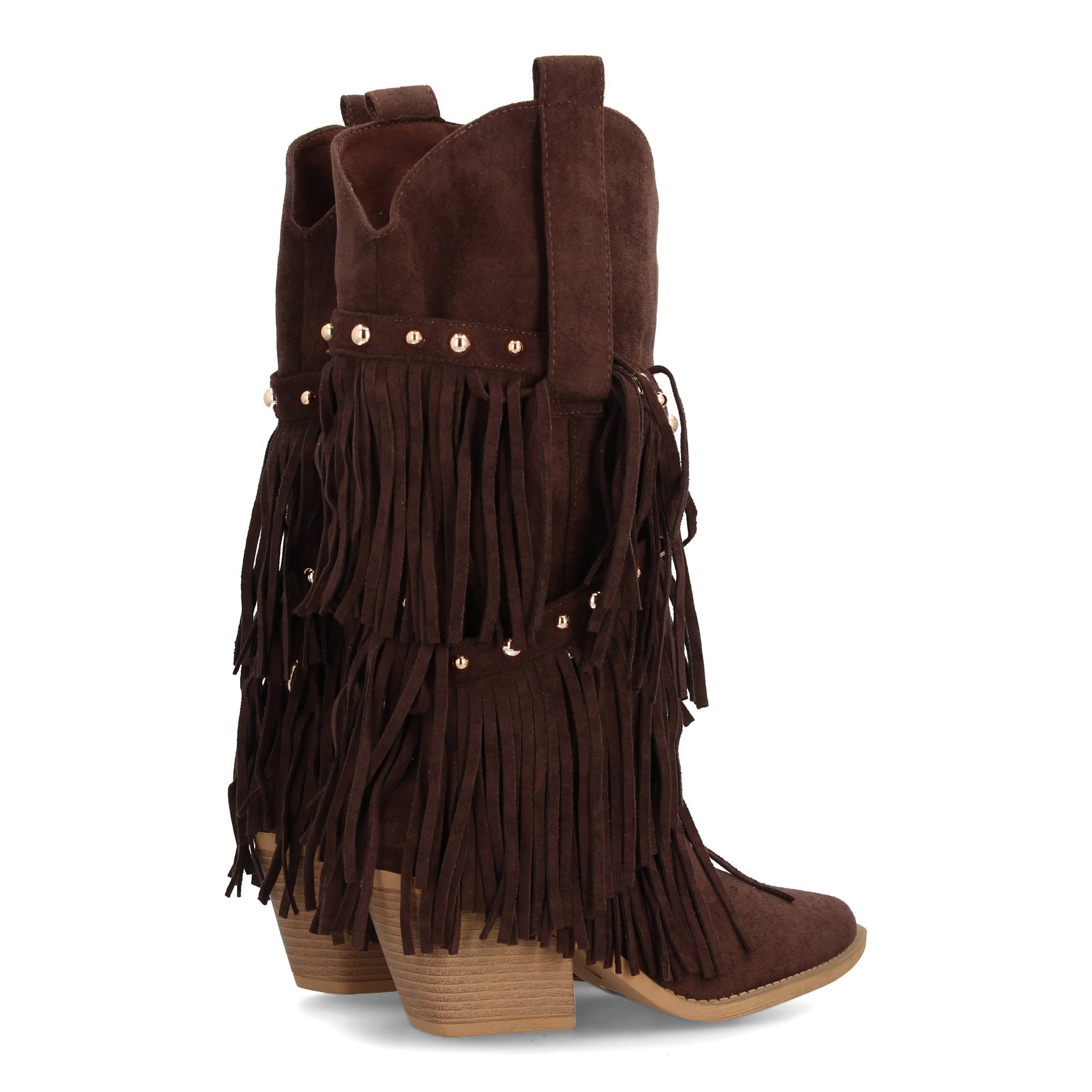 Bota de estilo western con caña alta decorada con flecos en cascada y tachuelas metálicas, punta fina y tacón cubano. Ideal para mujer en temporada de Otoño Invierno