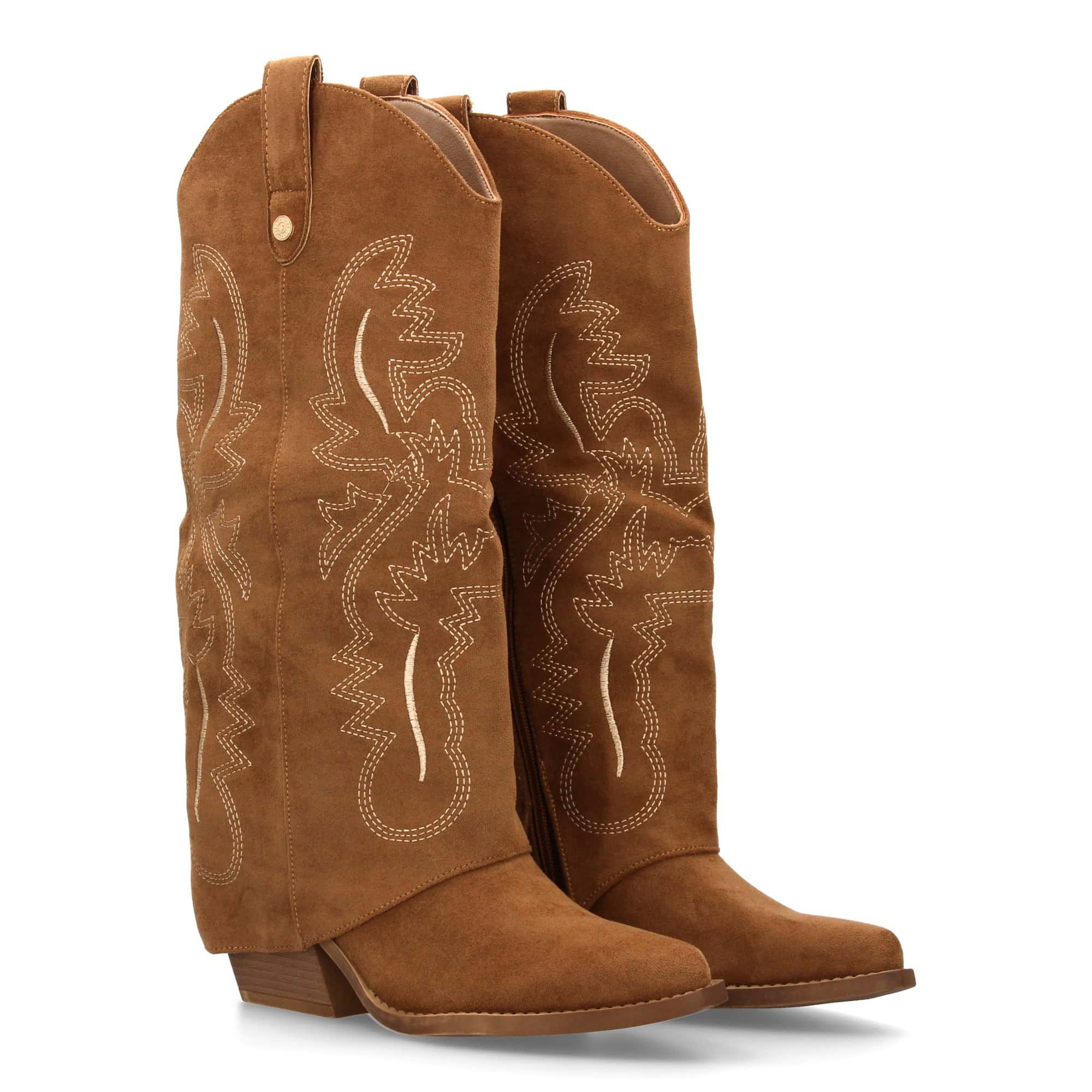 Bota para mujer estilo cowboy, acabada en punta y con grabados bordados en la caña. Tacon cubano y cierre de cremallera.