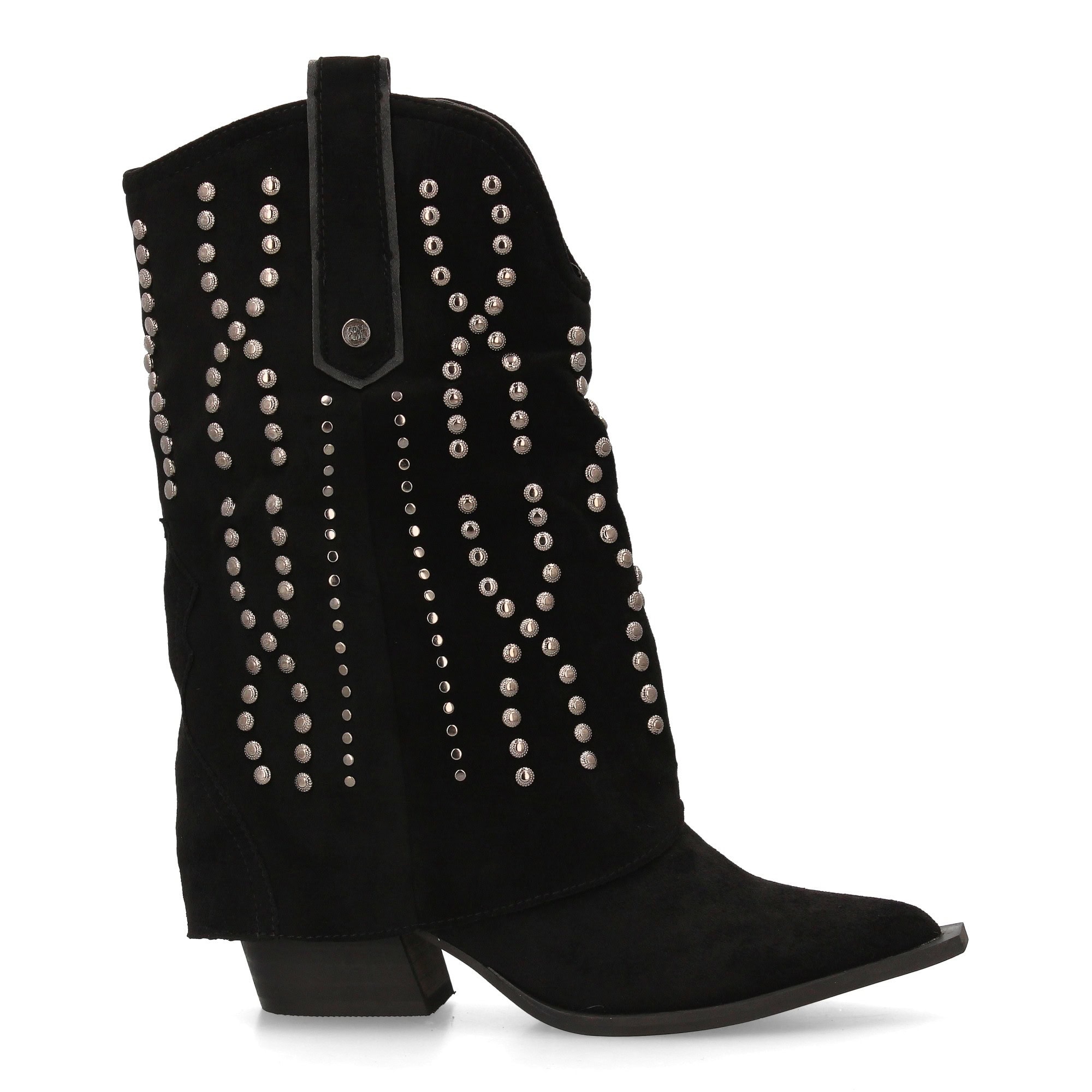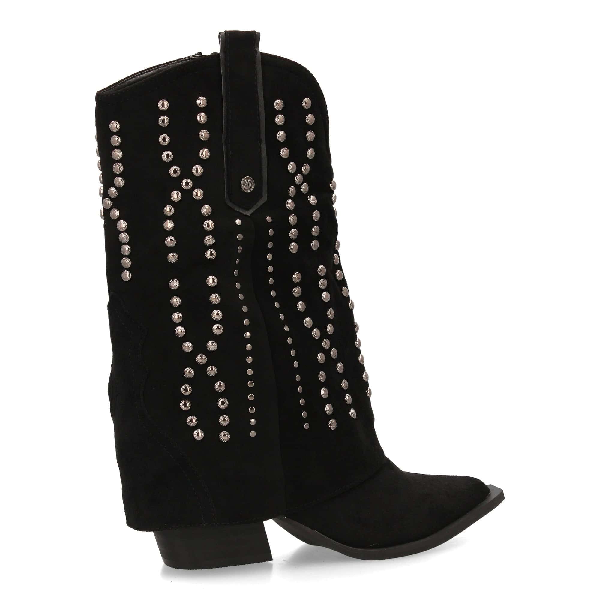Botín cowboy para mujer con caña media y diseño campero. Decorado con tachuelas metálicas en patrón geométrico, punta fina y tacón cubano cuadrado. Ideal para la temporada otoño invierno.