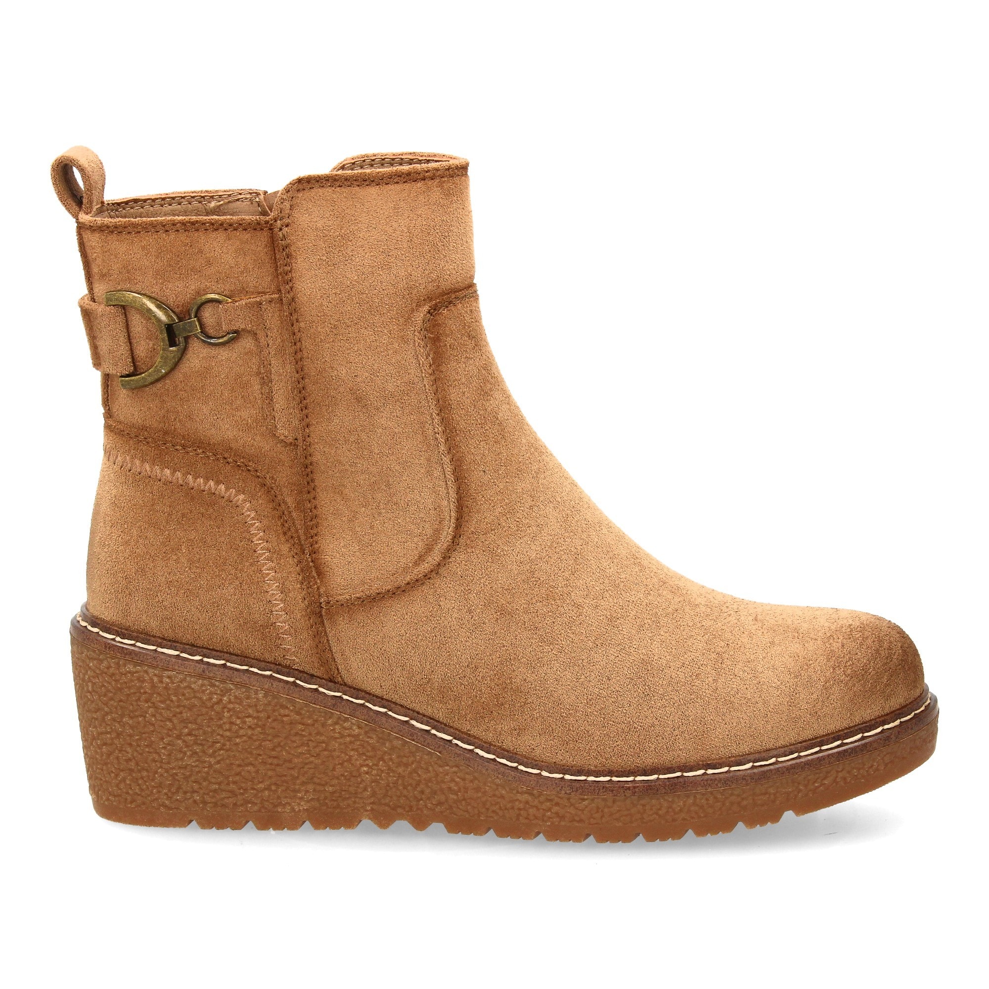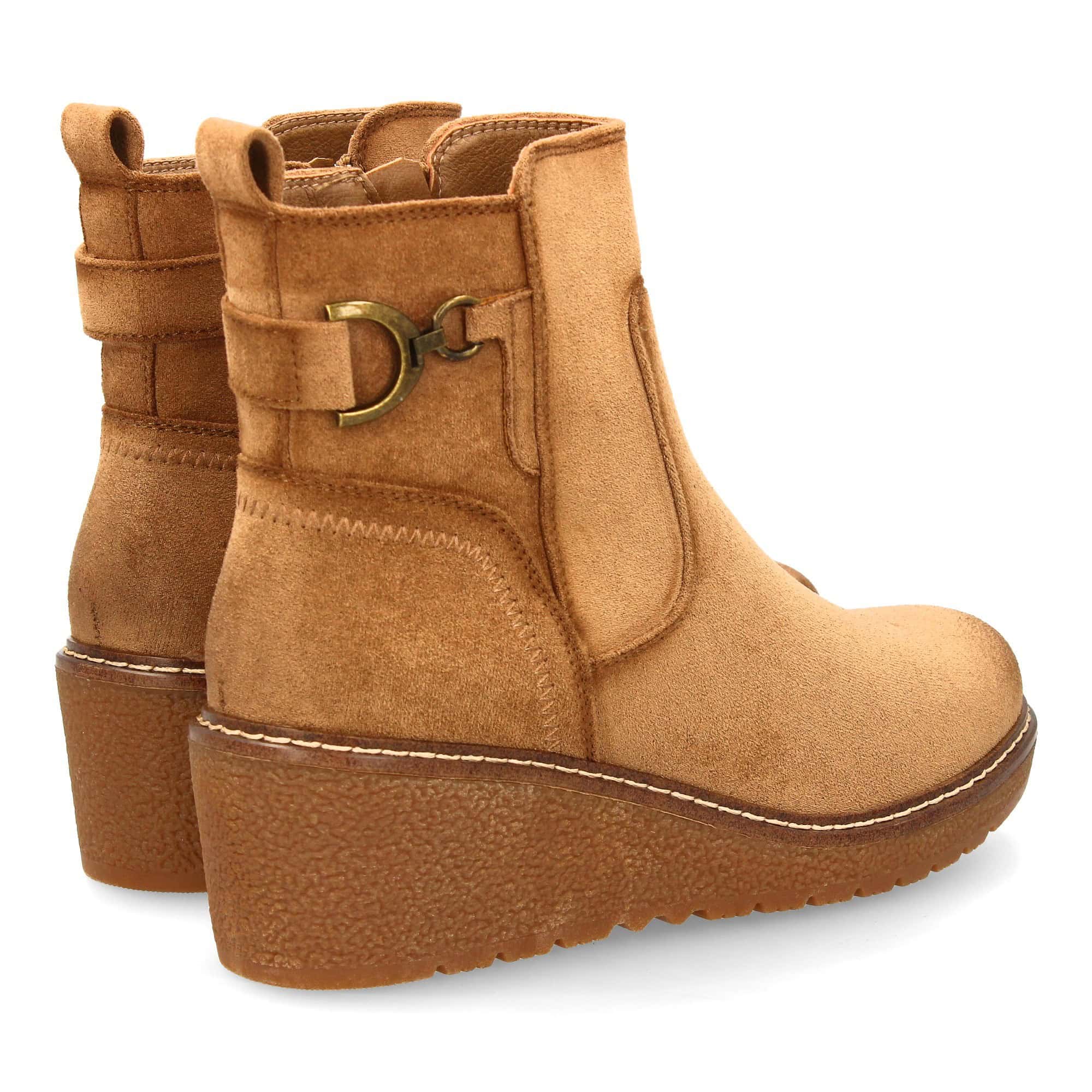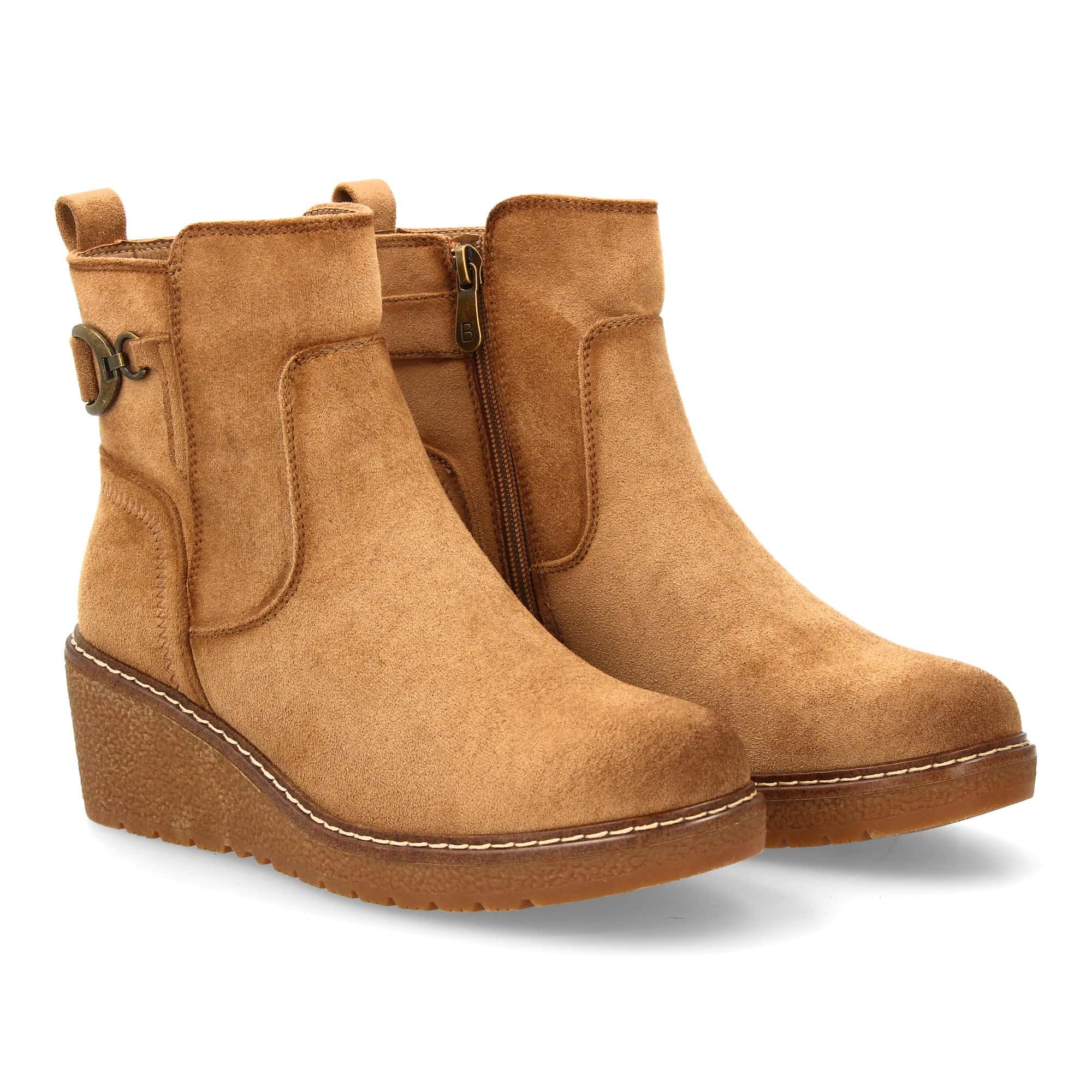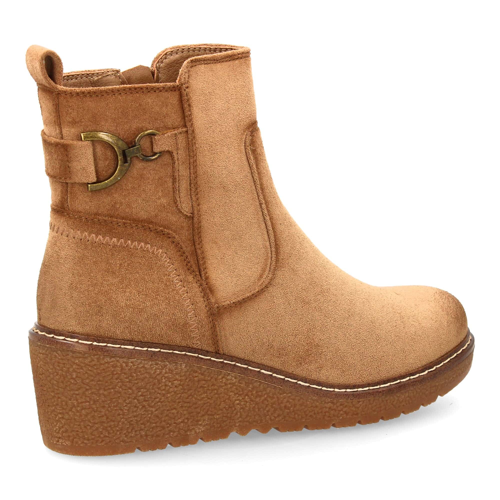 Botín para mujer con cuña cómoda para usar en el día a día. Diseño de adorno metálico lateral con estribo, cierre interior de cremallera.
