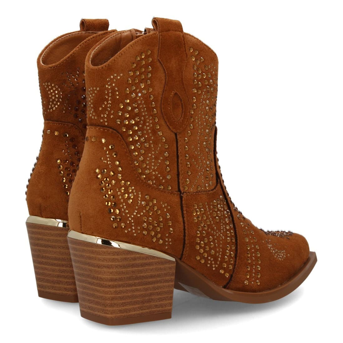 Botín de mujer con detalles brillantes y estilo cowboy, ideal otoño invierno