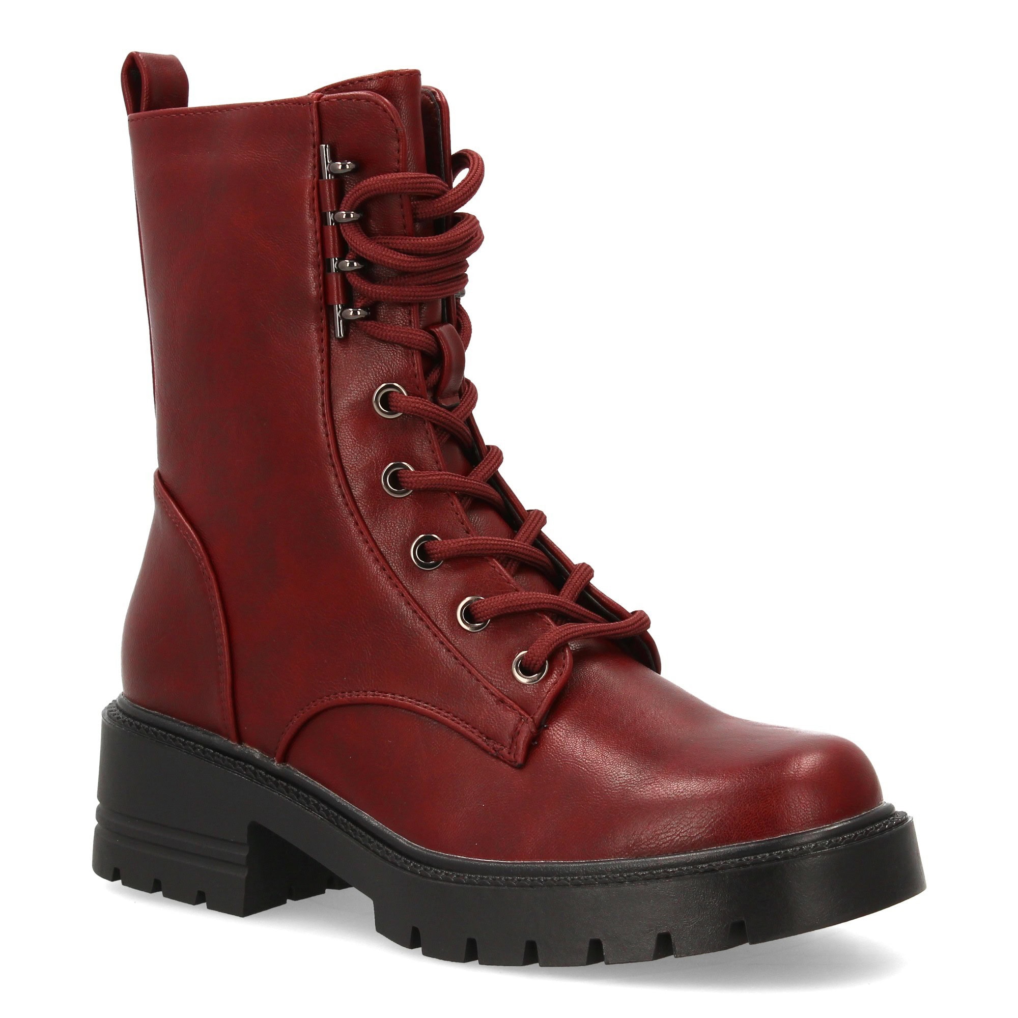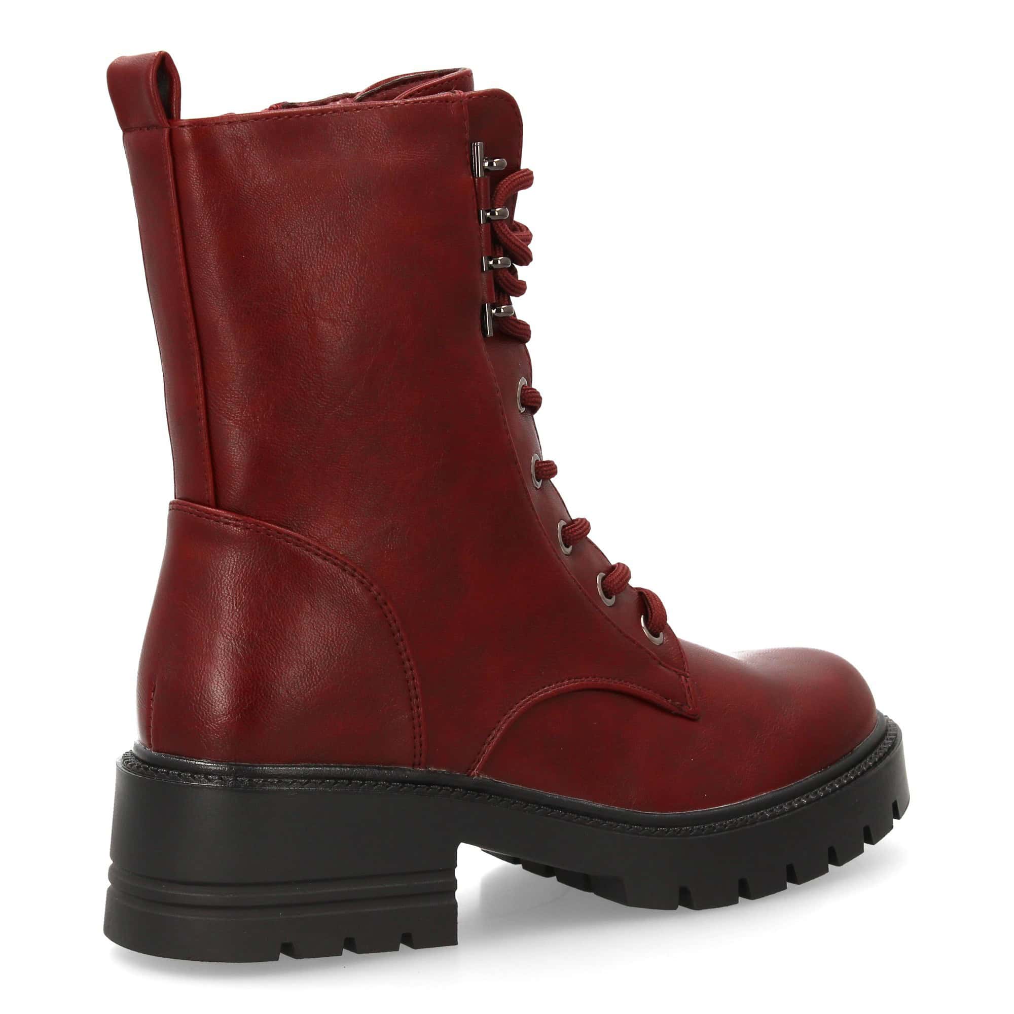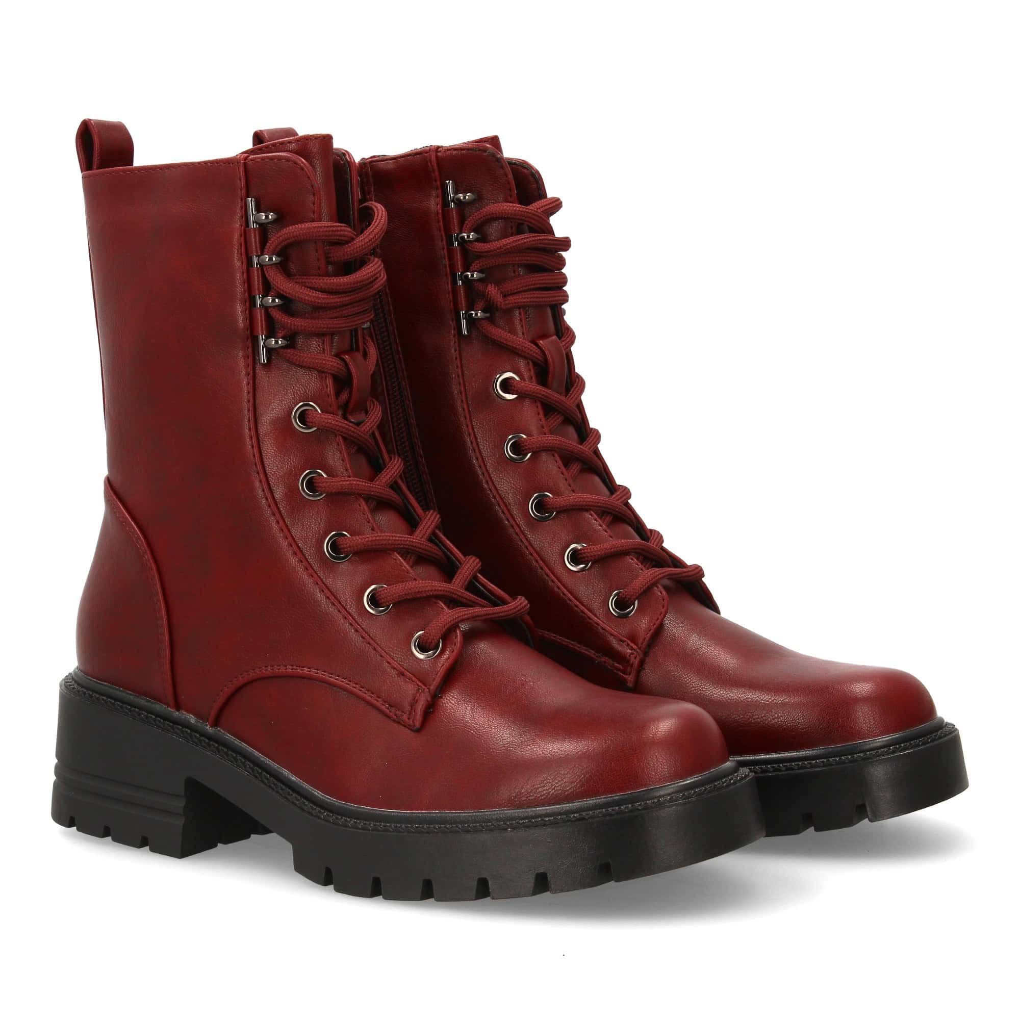 Bota estilo militar con cordones delanteros con detalles metálicos y suela gruesa. Cierre lateral de cremallera. Ideal para mujer en la temporada otoño invierno.