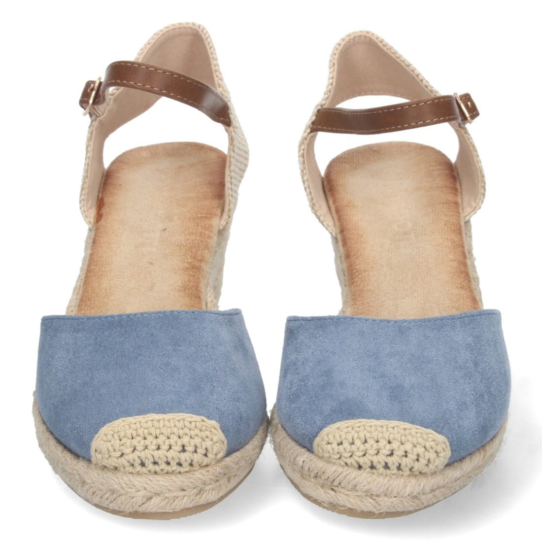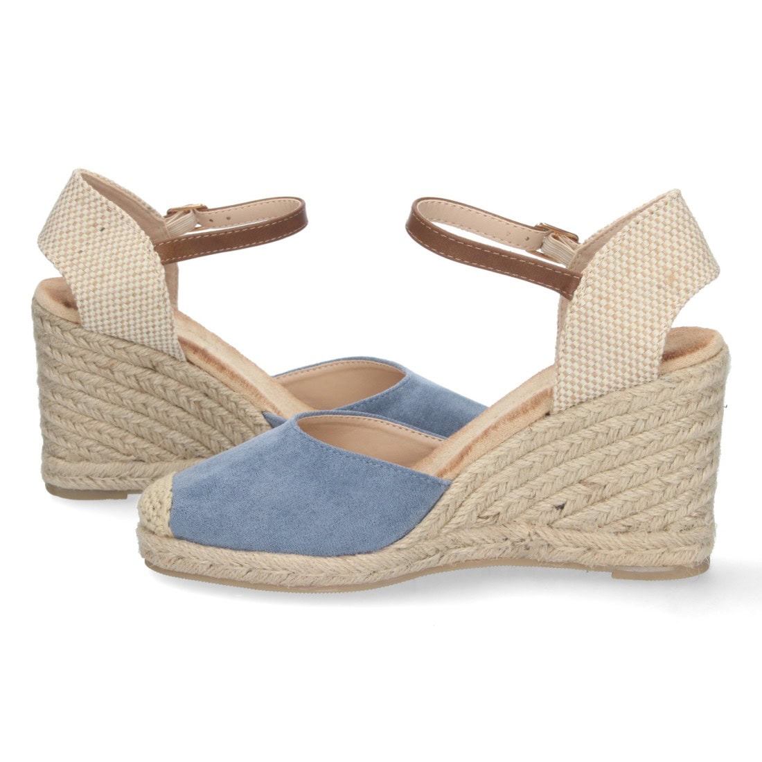 Sandalia de cuña para mujer, cómoda, con planta de bio, forrada de yute, talón abierto, y cierre de hebilla.