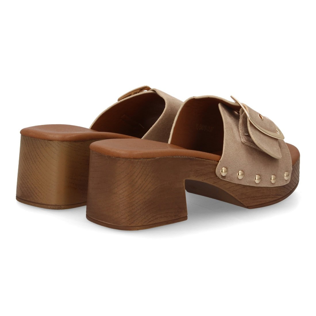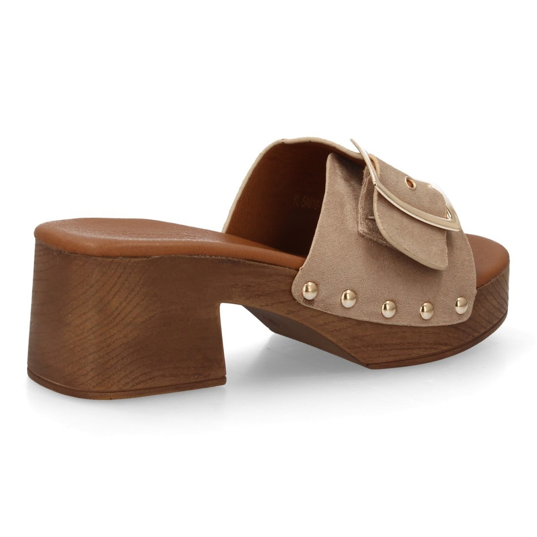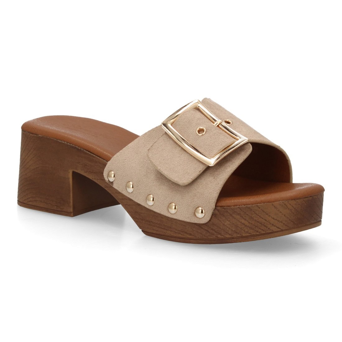 Sandalia tipo pala de mujer con tacón ancho simulando madera, pala con textura trenzada y hebilla, diseño de tachuelas metálicas Un modelo cómodo y ligero para primavera verano.
